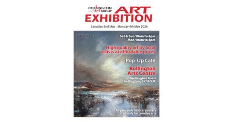 I will have nine, affordable, original artworks for sale at this year's Bollington Art Group Exhibition plus a range of greeting cards. There will be many other fabulous pieces of art available from local artists plus a pop up cafe selling gorgeous handmade cakes. Bollington Art Exhibition Bollington Arts Centre Wellington Road Bollington, SK10 5JR Saturday 2nd May to Monday 4th May 2026 Sat & Sun 10am to 4pm Mon 10am to 4pm