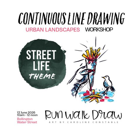 A fun, expressive 2-hour workshop for artists of all abilities - from absolute beginners who 'think they can't draw' to more experienced artists who get bogged down in detail. JUNE 13th THEME - STREET LIFE We’ll be sketching the vibrant, moving parts of the urban landscape: the bustle of outdoor cafés, dogs on their morning walks, colourful graffiti, and the rhythm of the summer pavement. This session is all about capturing movement and character with one fluid line.
