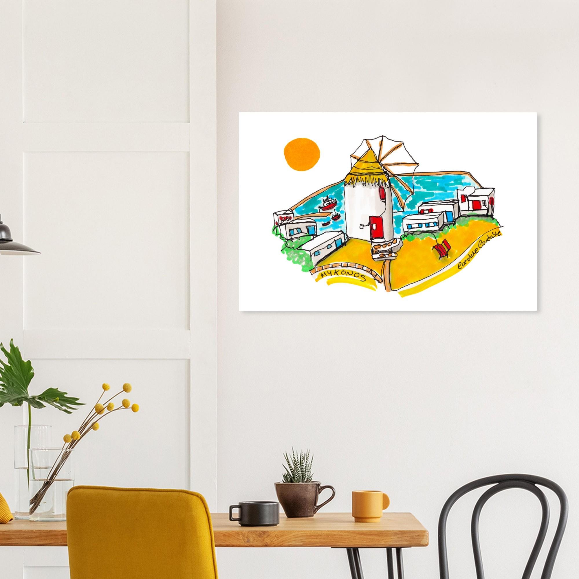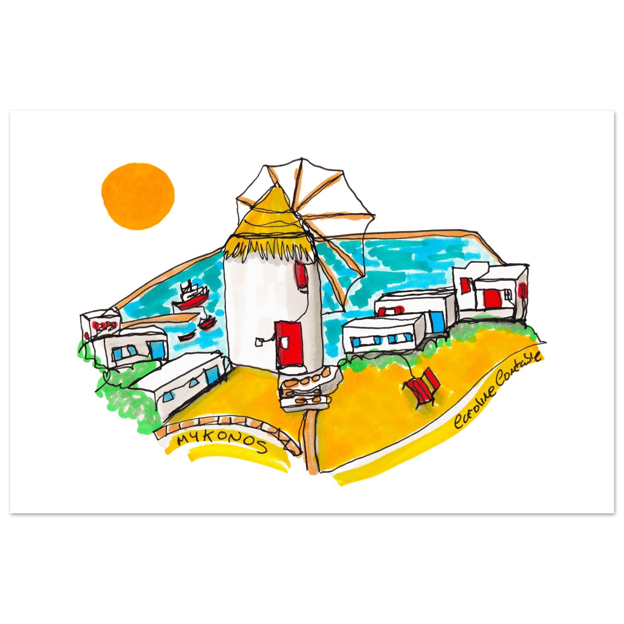 Print of an original hand-drawn continuous line illustration, coloured with alcohol marker pen of a Mykonos Windmill by Caroline Constable.