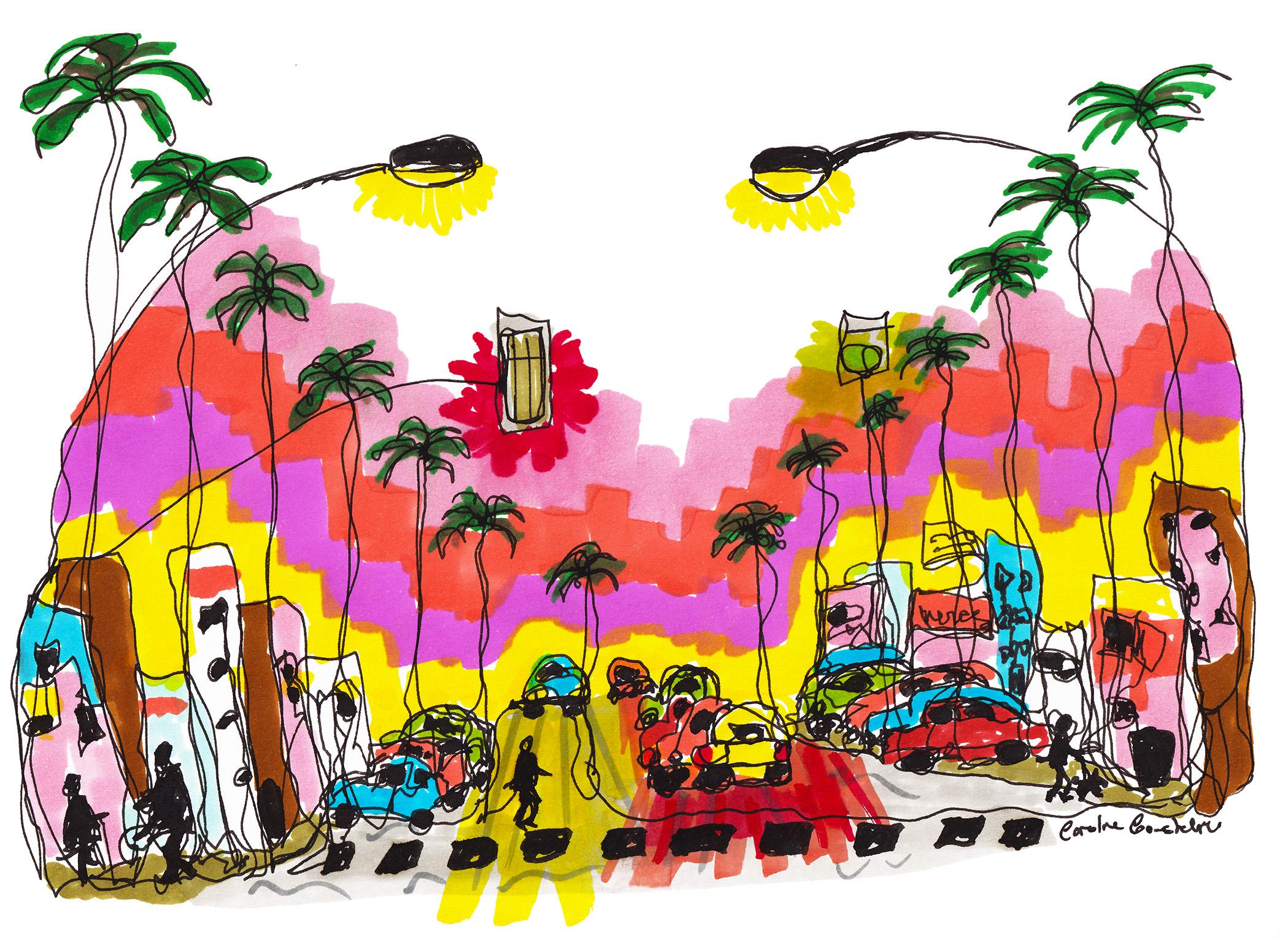 Sunset Strip, LA by Caroline Constable - a hand-drawn continuous line illustration coloured with alcohol marker pen.