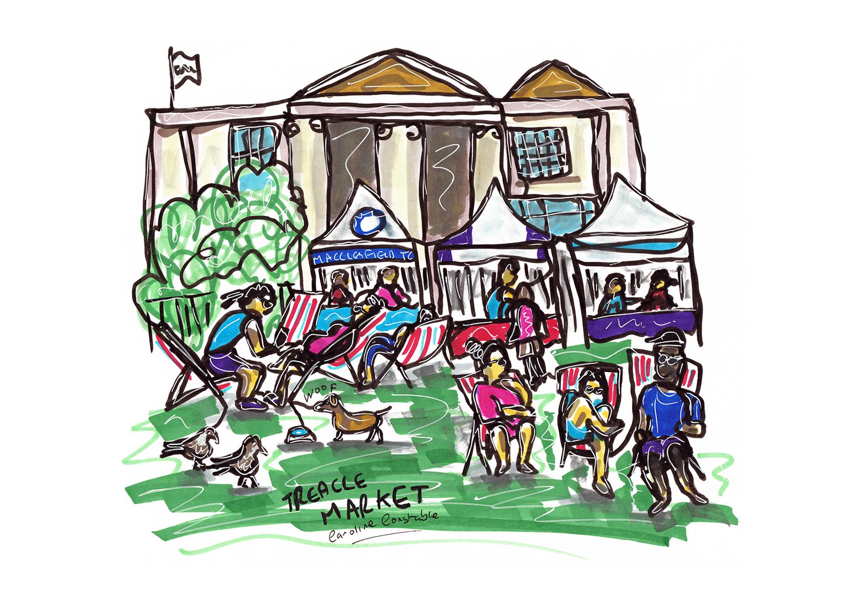 Treacle Market, Macclesfield by Caroline Constable - a hand-drawn continuous line illustration coloured with alcohol marker pen.