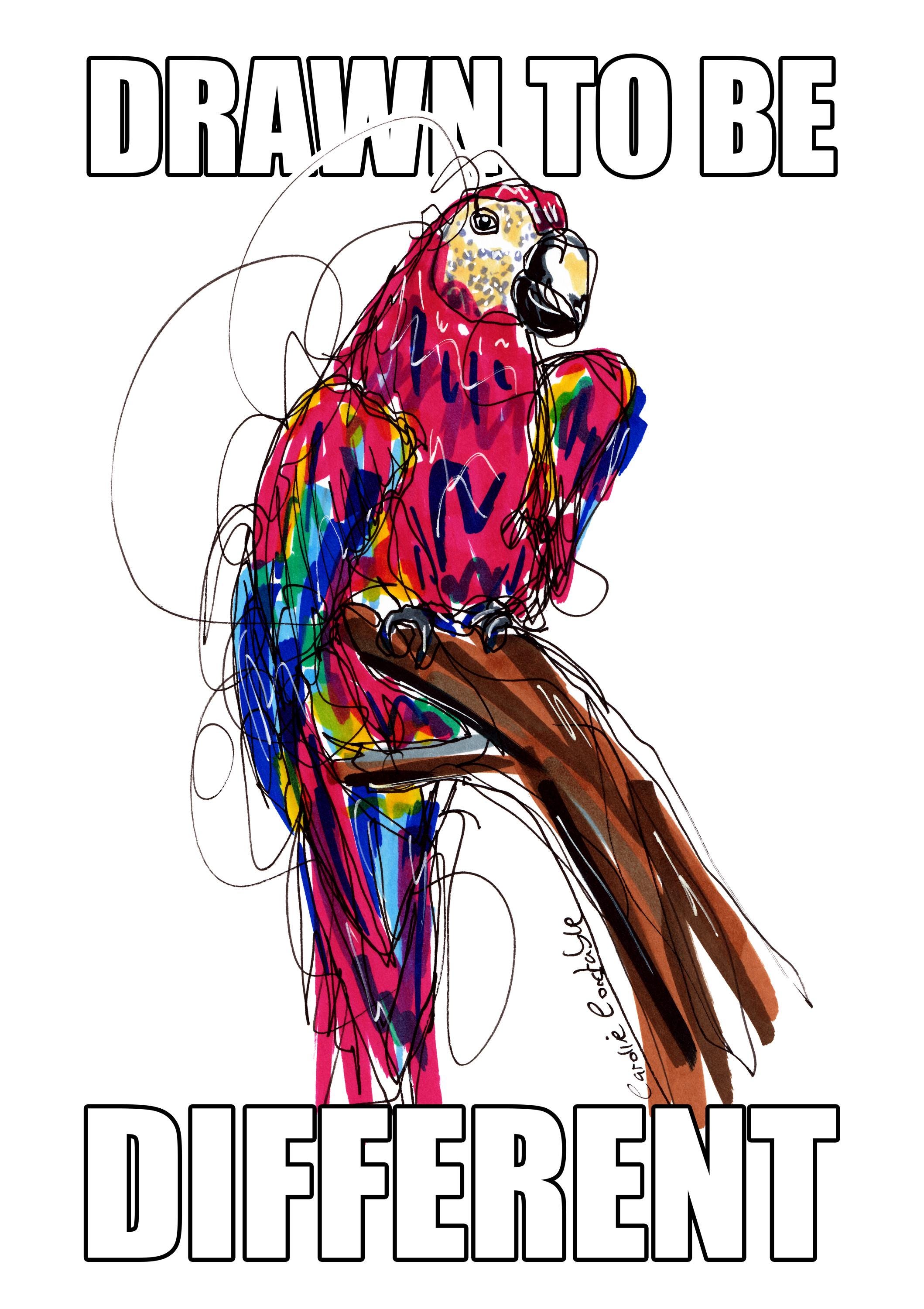 This artwork beautifully captures the essence of the parrot, known for its bold colors and captivating character. The phrase "Drawn to be Different" highlights the theme of embracing what makes us unique and standing out in a crowd.