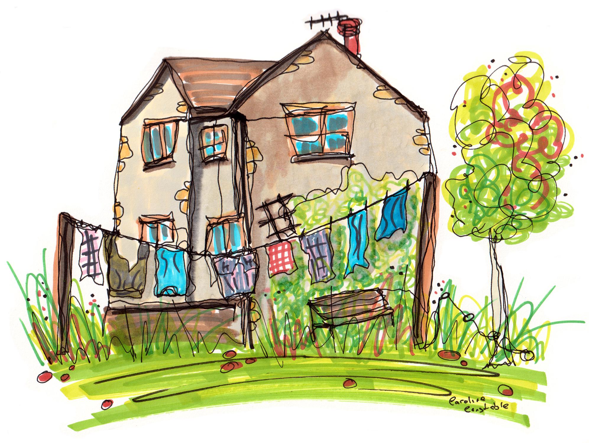 Washing Day, Rainow, Peak District by Caroline Constable - a hand-drawn continuous line illustration coloured with alcohol marker pen.