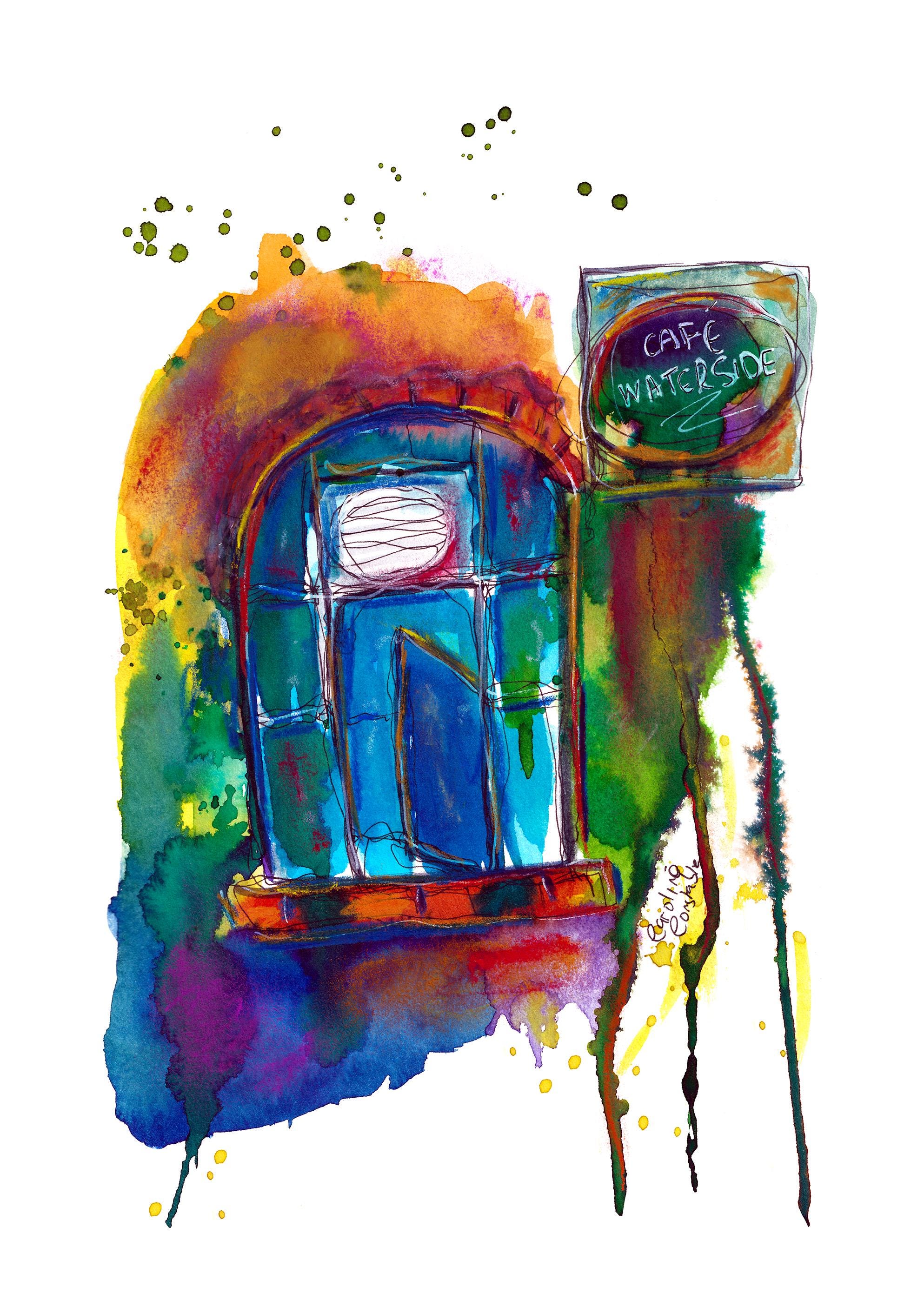 Cafe Waterside, Bollington, Cheshire - Continuous line drawing hand painted with watercolour.