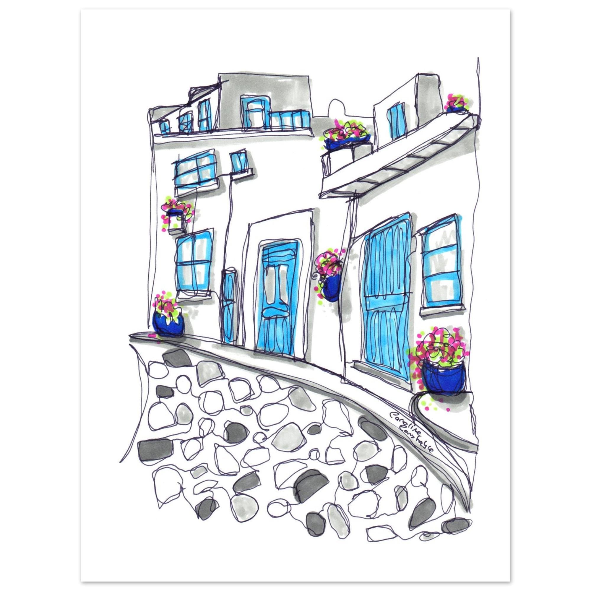 Print of an original hand-drawn continuous line illustration, coloured with alcohol marker pen of a Mykonos street by Caroline Constable.