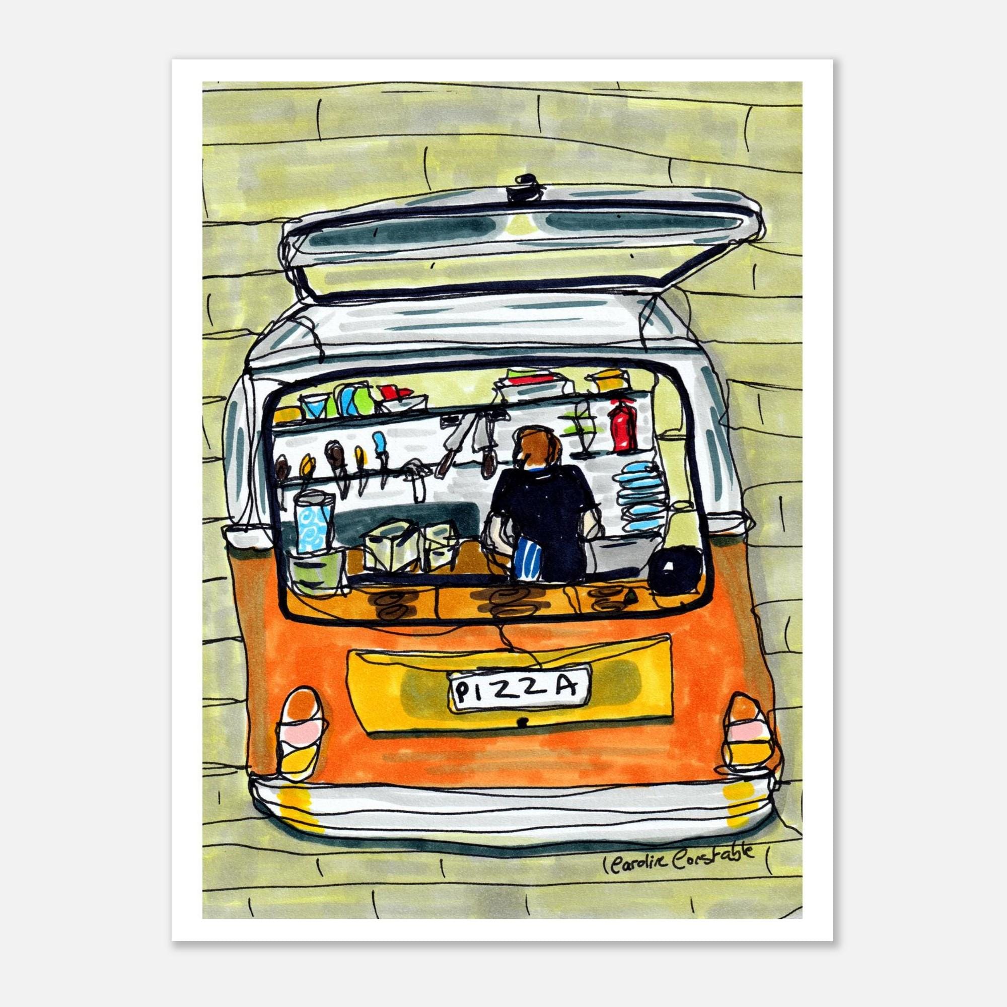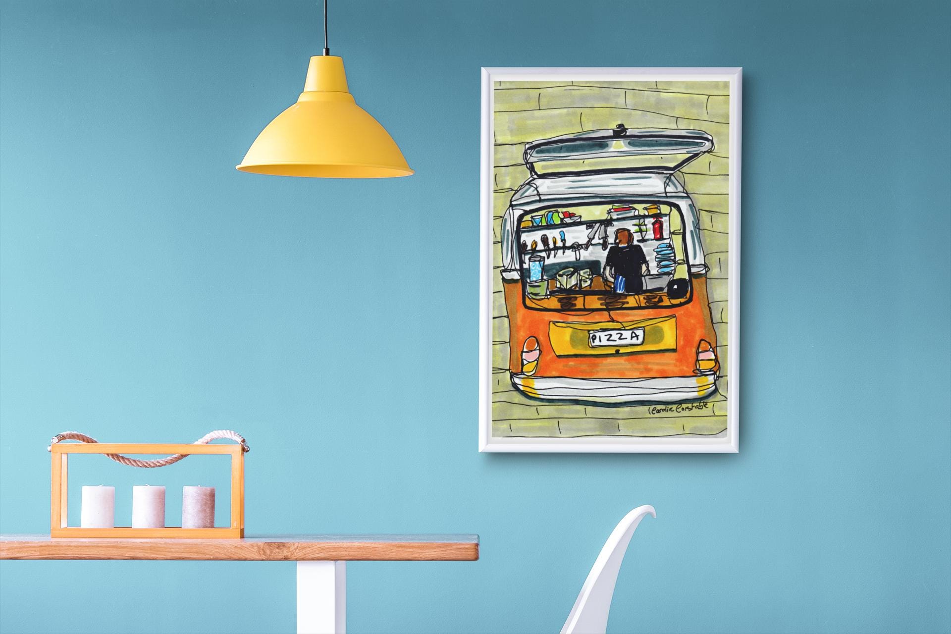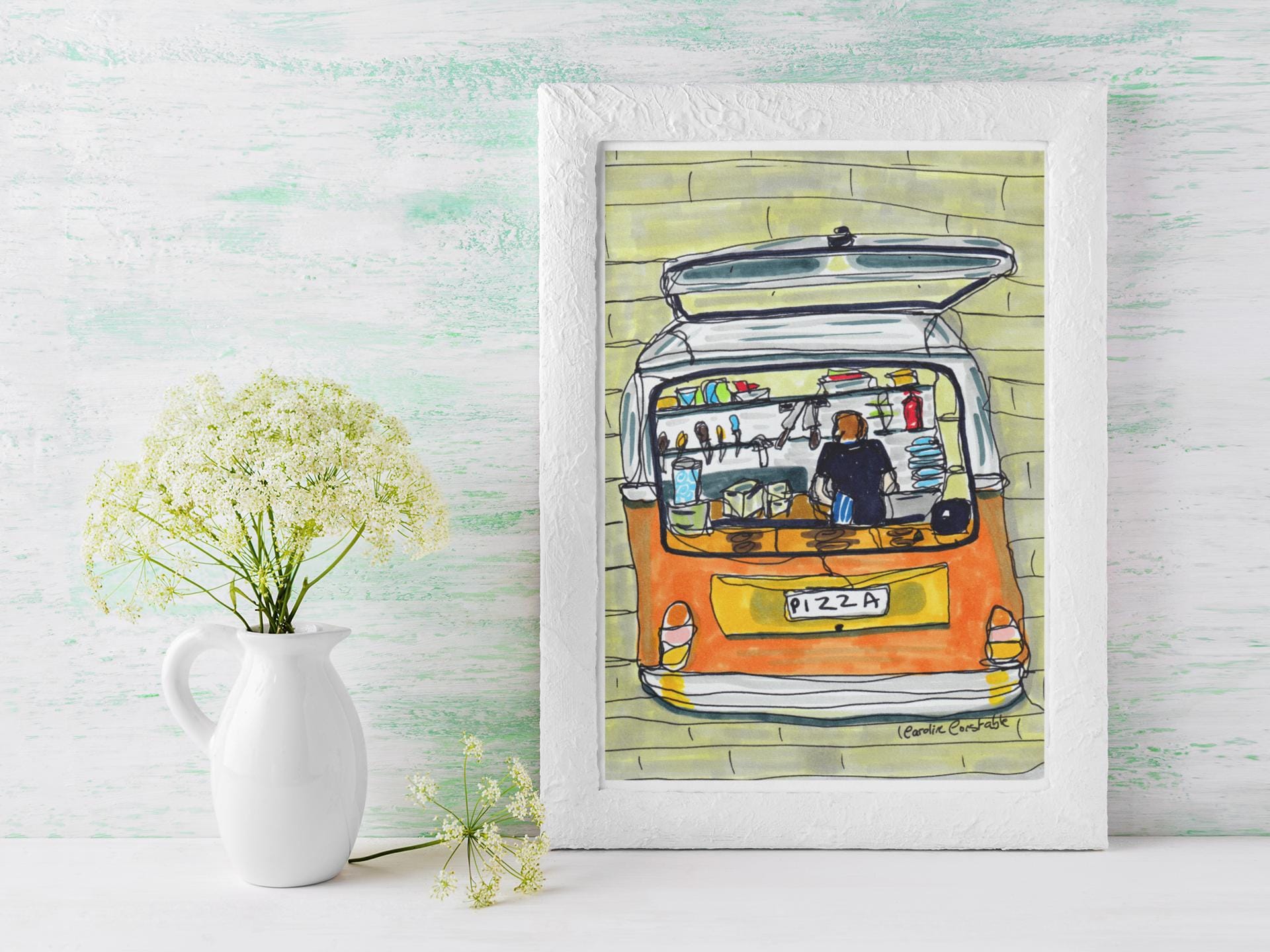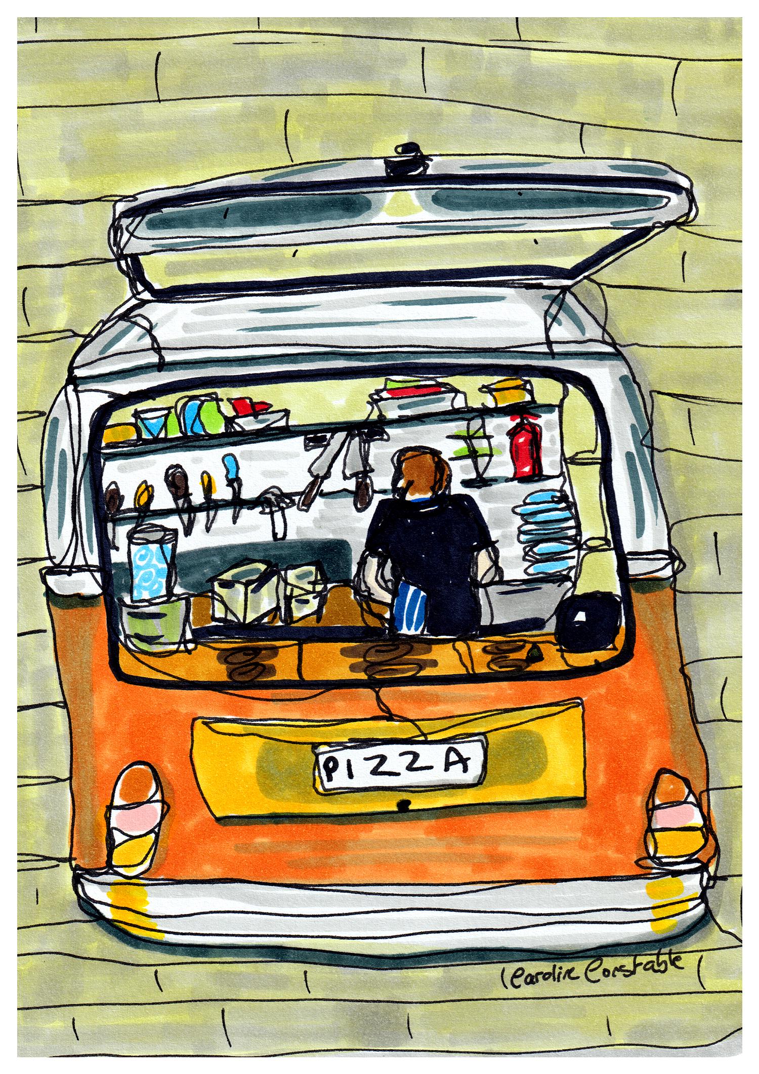 Caroline took the reference photo whilst on holiday in Devon. The artwork now features on the official merch for The Cove Bar & Restaurant in Hope Cove where the pizza kitchen is situated.