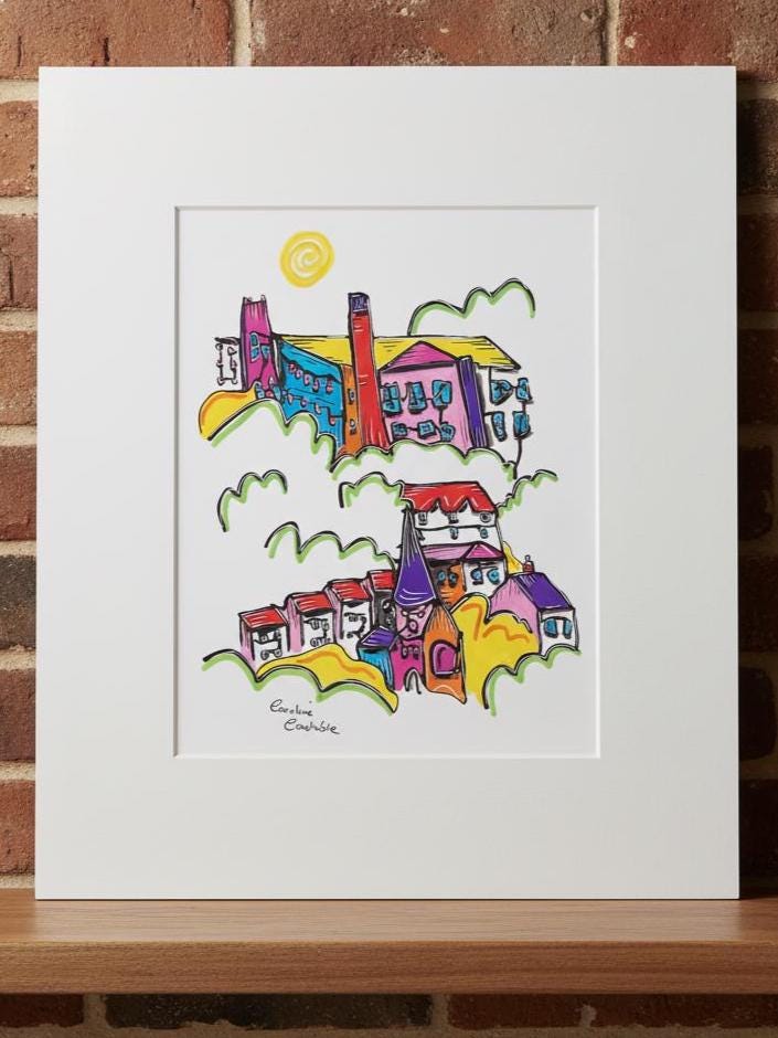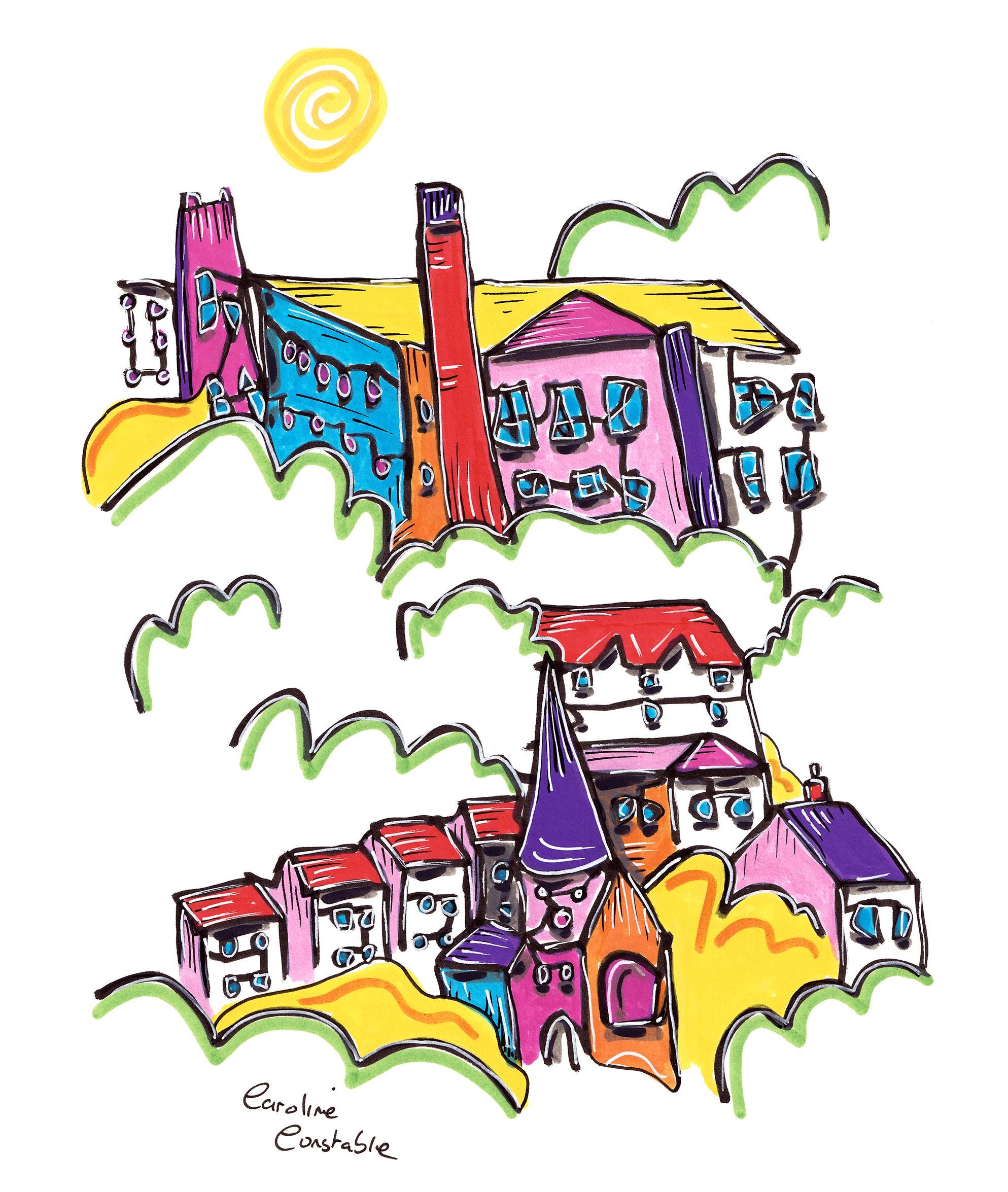 'The View over Bollington' is a Continuous line drawing with colourful acrylic markers.