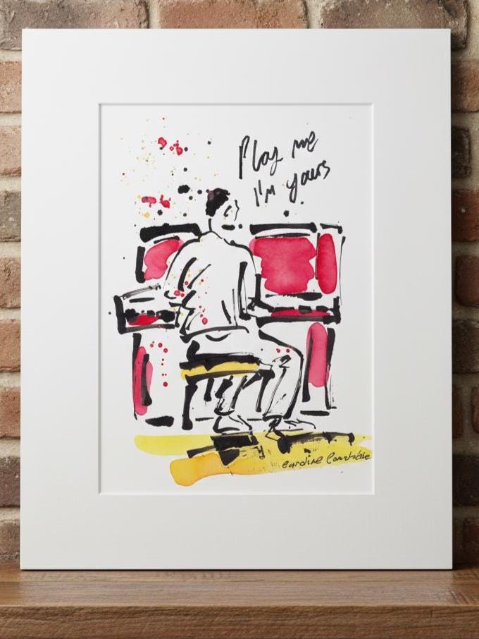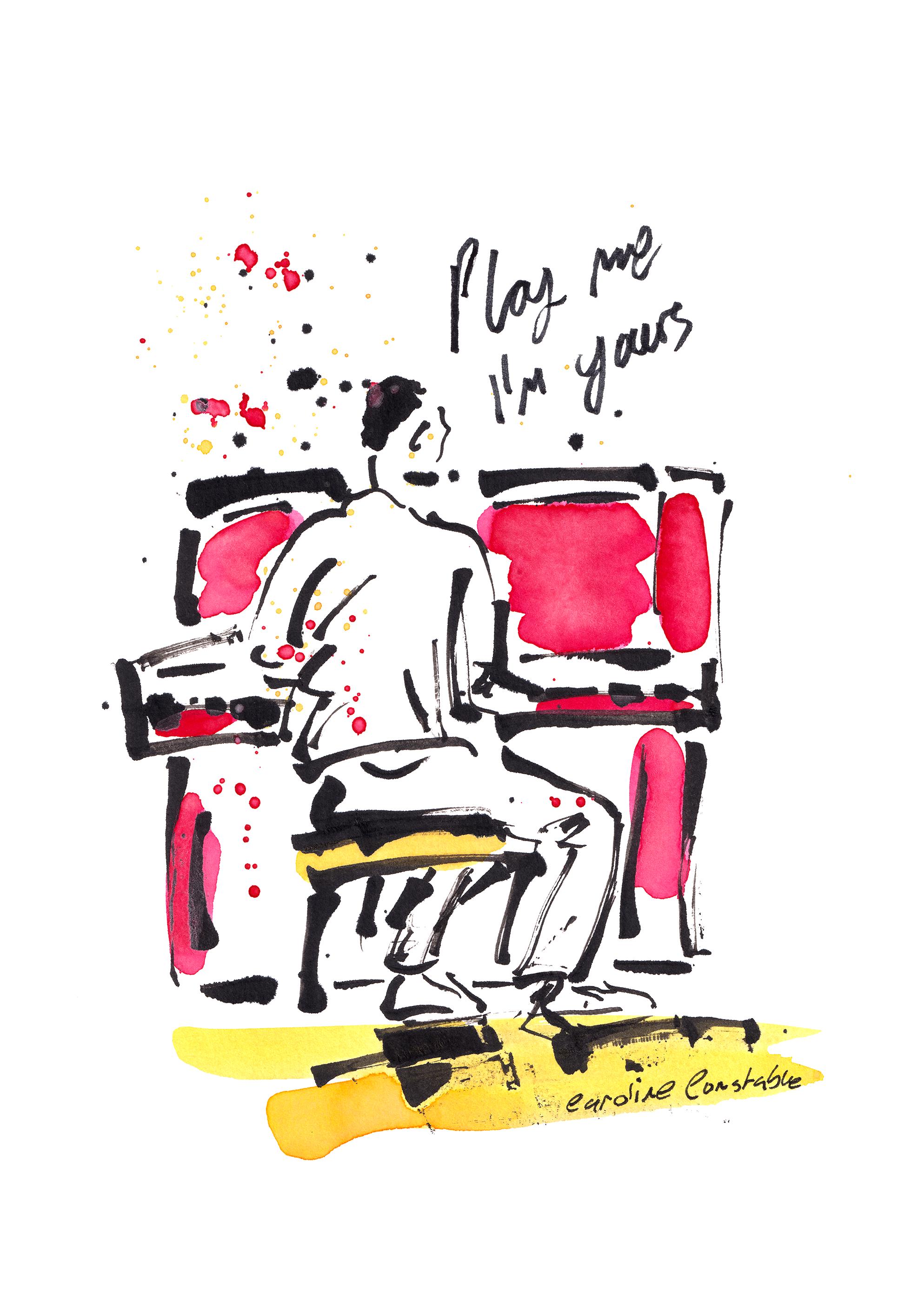 'Play Me I'm Yours' was sketched with a dip pen and Indian ink with a splash of red and yellow.