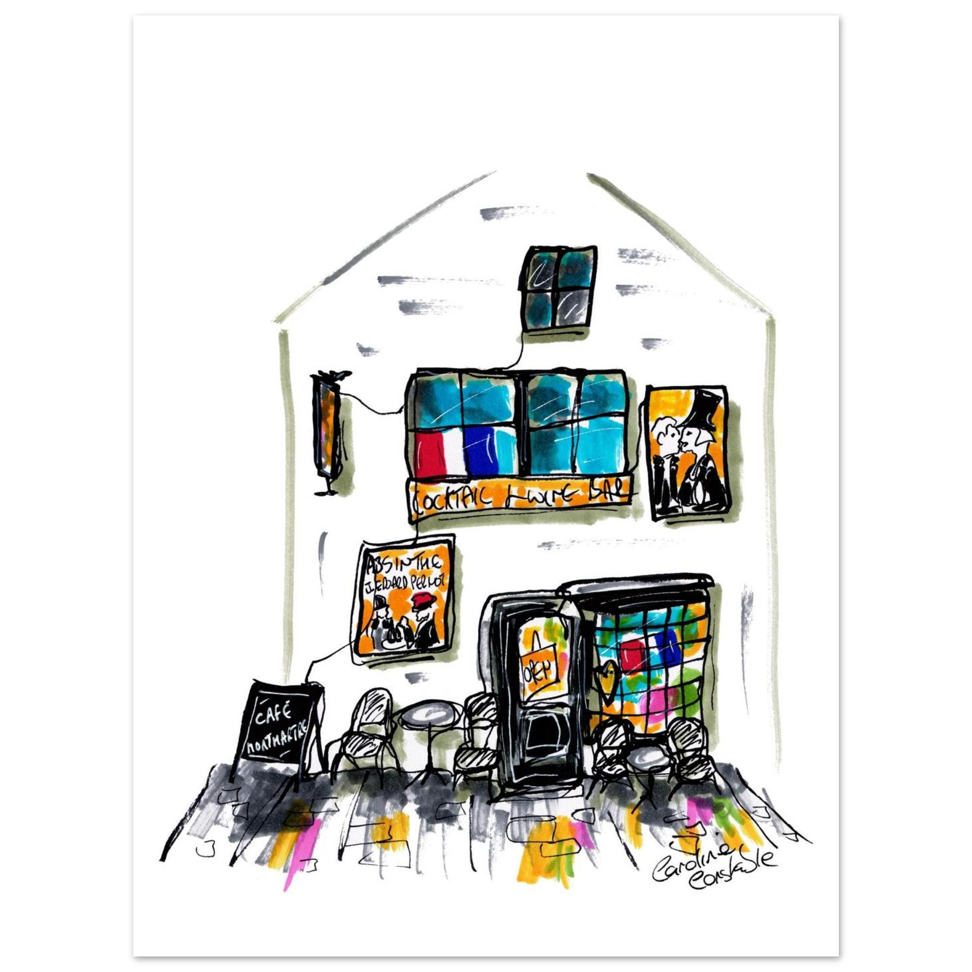 Cafe Montmartre, Whitby, Yorkshire - a hand-drawn continuous line sketch with marker pen by Caroline Constable.